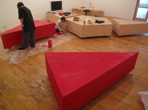 "Atelier STAR’S ANATOMY is a performance / installation project, which consists of the construction and manipulation of a module-star-shaped sofa made of 6 separable pieces. The star will serve as a place to live and work in a kind of an exhibition / campement / workshop. We will live, eat, sleep, draw, read, on the structure, largely in the presence of the public, or guest pass. The different emplacement of the pieces of the star serves as a pretext for different activities, thus providing an image always different. Through the preparatory drawings (presented at Bina Ellen Gallery) we try to imagine the performance and installation that will be completed and presented to the space 514, of the Belgo building. The drawings made previously, reinforce the context of upcoming project. Performance and installation become pretexts for exploration with this central point turning between drawing and performance. While making a clin d’oeil to our youth lived in communist Albania, this project reflects also a reflection on symbols and their multiple possibilities of reinterpretation and reconfiguration."