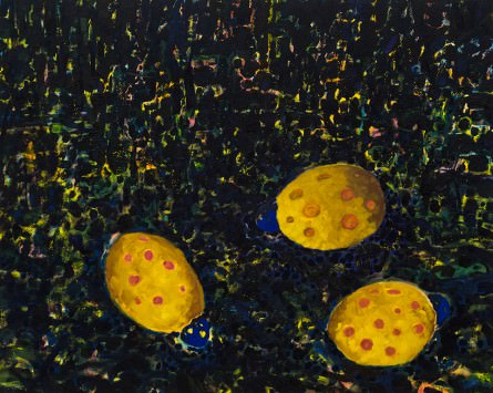 «My paintings depict nocturnal world borderline between chaotic wilderness and a garden pastoral, buzzing with colors, energies and life. Depopulated of human beings in a possibly apocalyptic twist, the denizens of these works are bugs, potentially sentient, possibly without self-awareness.»