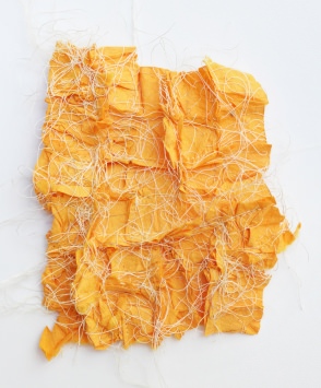 The artworks presented in the exhibition INHABITING consist of handmade paper created by Sarah Bertrand-Hamel through which the artist manipulates fibres, colours, textures and translucency. Stitches, folds or wrinkles become lines, letting drawings to appear.
